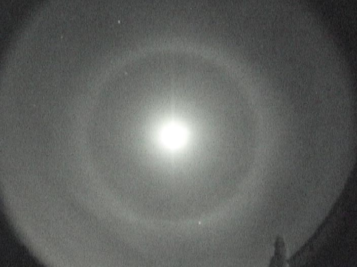 The white dots may be artifacts. Moon is overexposed to show halo.