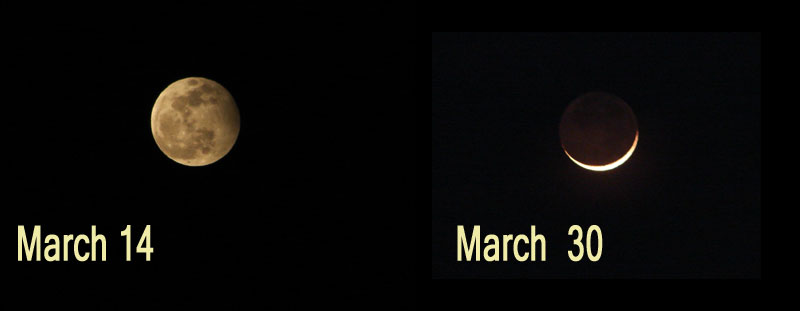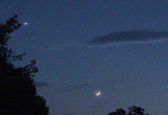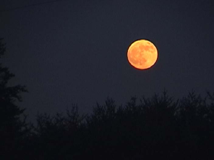 The white dots may be artifacts. Moon is overexposed to show halo.